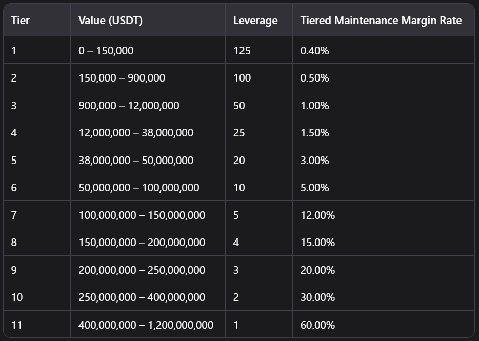 SorooshX has established a tier structure where each range of position sizes corresponds to a specific tier with an associated MMR. Below is an outline of the BTCUSDT USDT-M futures tier structure: